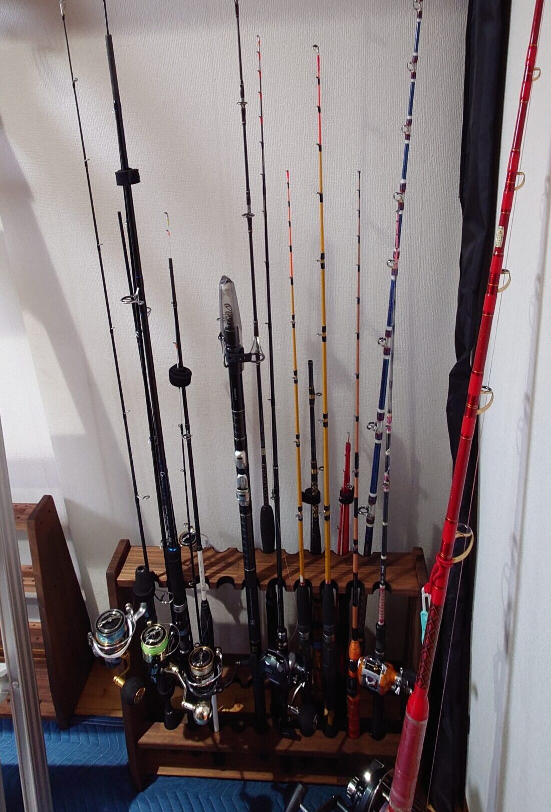 1階玄関脇に有る小部屋は、趣味(主に釣り)の用具置き部屋としました。結構な収容力が有り、大原港から深海釣り、マダイ釣り、ヒラメ釣り、フグ釣りなどに対応したロッドや仕掛け・材料などを装備しているので、いつでも好きな時に釣りに行けます。また、サーフからのルアー釣りなどにも対応。冬場なら大原の海岸からヒラメなども釣れたりします。